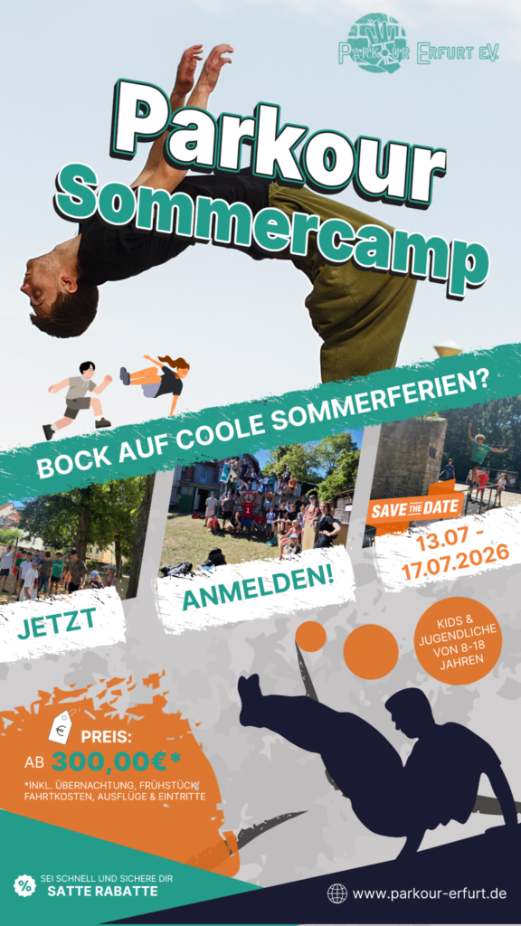 Der Parkour Erfurt e.V. wurde Ende 2018 gegründet. Seit 2022 befinden wir uns stetig im Wachstum. Mittlerweile organisieren wir mehrere jährliche Veranstaltungen (z.B. die Open Airfurt Jam oder den Chase Erfurt) und führen unterschiedliche Ausflüge ganzjährig durch. Wir bieten allen Altersgruppen ab 6 Jahren aufwärts vielfältige Angebote. (Kindersport, Parkourtraining, Präventionskurse)